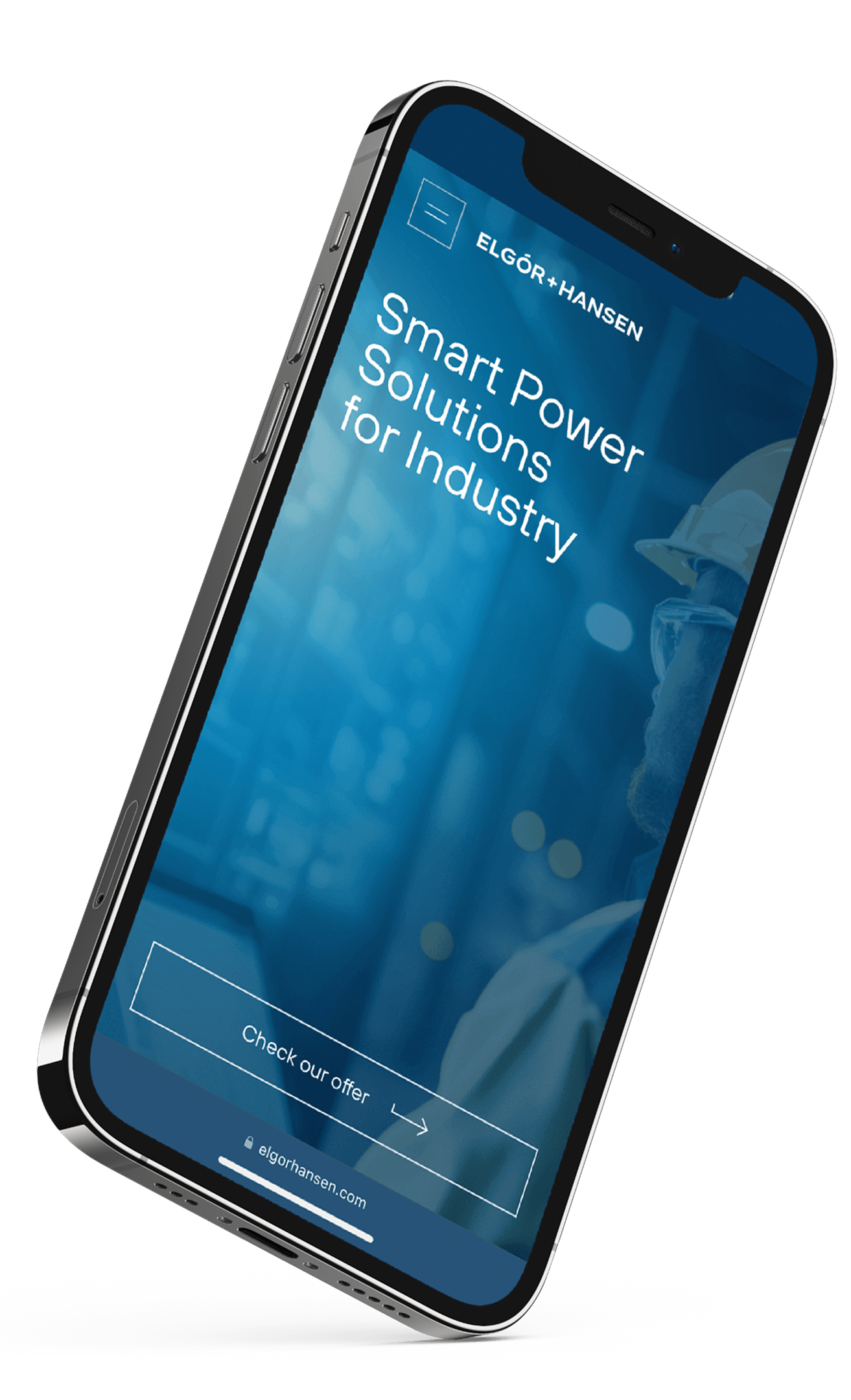 A smartphone displaying the user-friendly Elgor+Hansen WordPress website with the text "Smart Power Solutions for Industry" and a button labeled "Check our offer" on a blue background, featuring a faint image of a worker in a hard hat.